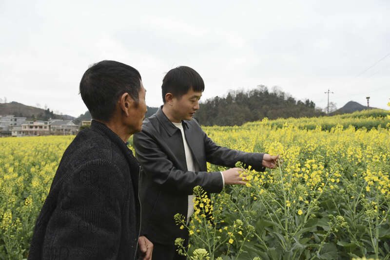 初春,遵义市播州区茅栗镇花果村油菜花开,一抹阳光洒下,田野中金黄灿灿。村民钟时福与从贵阳赶来的“揭榜挂帅”专家凡迪站在田埂上,仔细观察油菜长势。