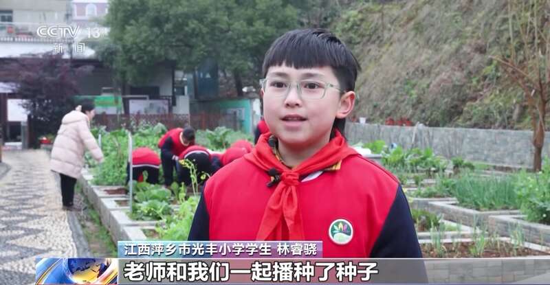 在江西萍乡,光丰小学的老师将新学期的第一课放到了室外,孩子们来到菜园实地观察各种农作物,将手中的蔬菜种子播撒在土地里,亲身体验劳动的过程。