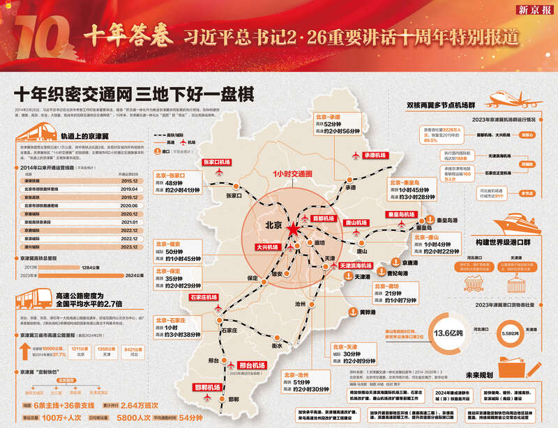 今天是京津冀协同发展重大国家战略实施十周年。2014年2月26日,习近平总书记在北京市考察工作时发表重要讲话,强调“把交通一体化作为推进京津冀协同发展的先行领域,加快构建快速、便捷、高效、安全、大容量、低成本的互联互通综合交通网络”。10年来,京津冀交通一体化从“蓝图”到“现实”,交出亮眼成绩单。