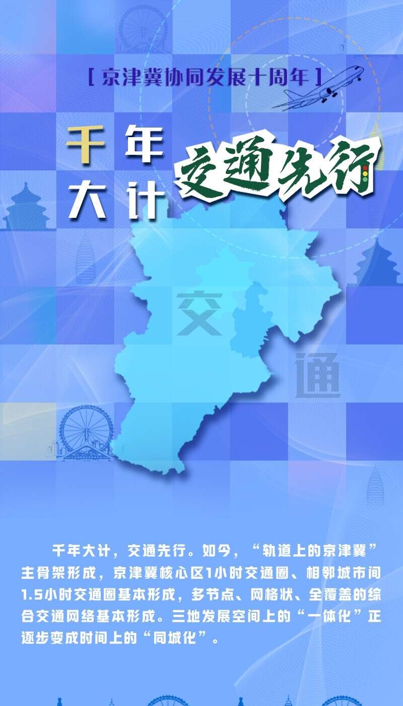 千年大计,交通先行。如今,“轨道上的京津冀”主骨架形成,京津冀核心区1小时交通圈、相邻城市间1.5小时交通圈基本形成,多节点、网格状、全覆盖的综合交通网络基本形成。三地发展空间上的“一体化”正逐步变成时间上的“同城化”。