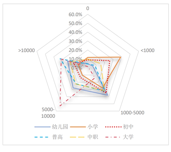 从家庭负担的角度分析,各学段家庭教育负担率最低的是义务教育阶段,其次是学前教育阶段。高中学段、大学学段家庭负担率上升。到大学阶段,家庭教育负担率上升,“学前教育的负担与高中接近”。研究发现,农村家庭,每一个大学在校生的教育支出占全家总支出的35%。