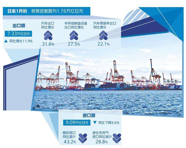 数据显示,在出口方面,1月份日本受汽车、半导体制造设备、汽车零部件等出口增长拉动,出口额达7.33万亿日元,同比增长11.9%,连续2个月增长。进口方面,国际能源市场价格回落成为拉低进口额的主要原因,1月份进口额为9.09万亿日元,同比下降9.6%,连续10个月减少。其中煤炭进口额为4299亿日元,同比减少43.2%;液化天然气为6224亿日元,同比减少28.8%。此外,通信设备进口减少了21.9%。