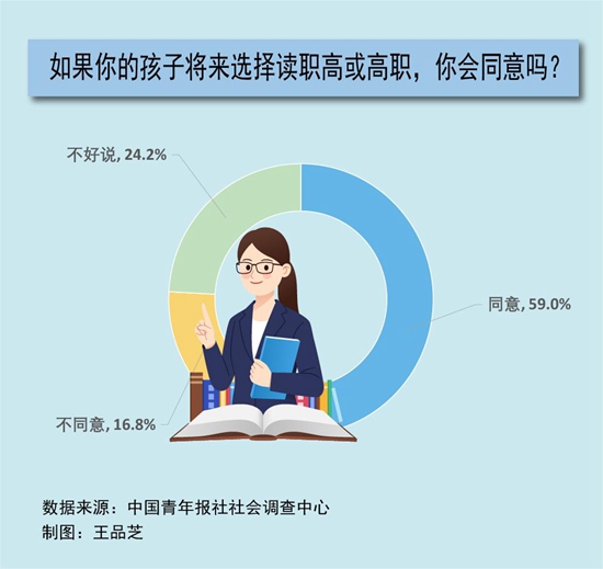 调查显示,如果孩子将来选择读职高或高职,59.0%的受访者表示同意,16.8%的受访者不同意,24.2%的受访者表示不好说。