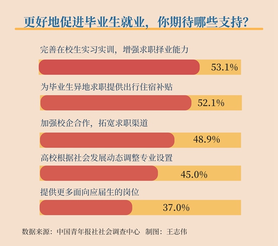 调查显示,更好地促进毕业生就业,53.1%的受访者期待完善在校生实习实训,增强求职择业能力,52.1%的受访者希望为毕业生异地求职提供出行住宿补贴。