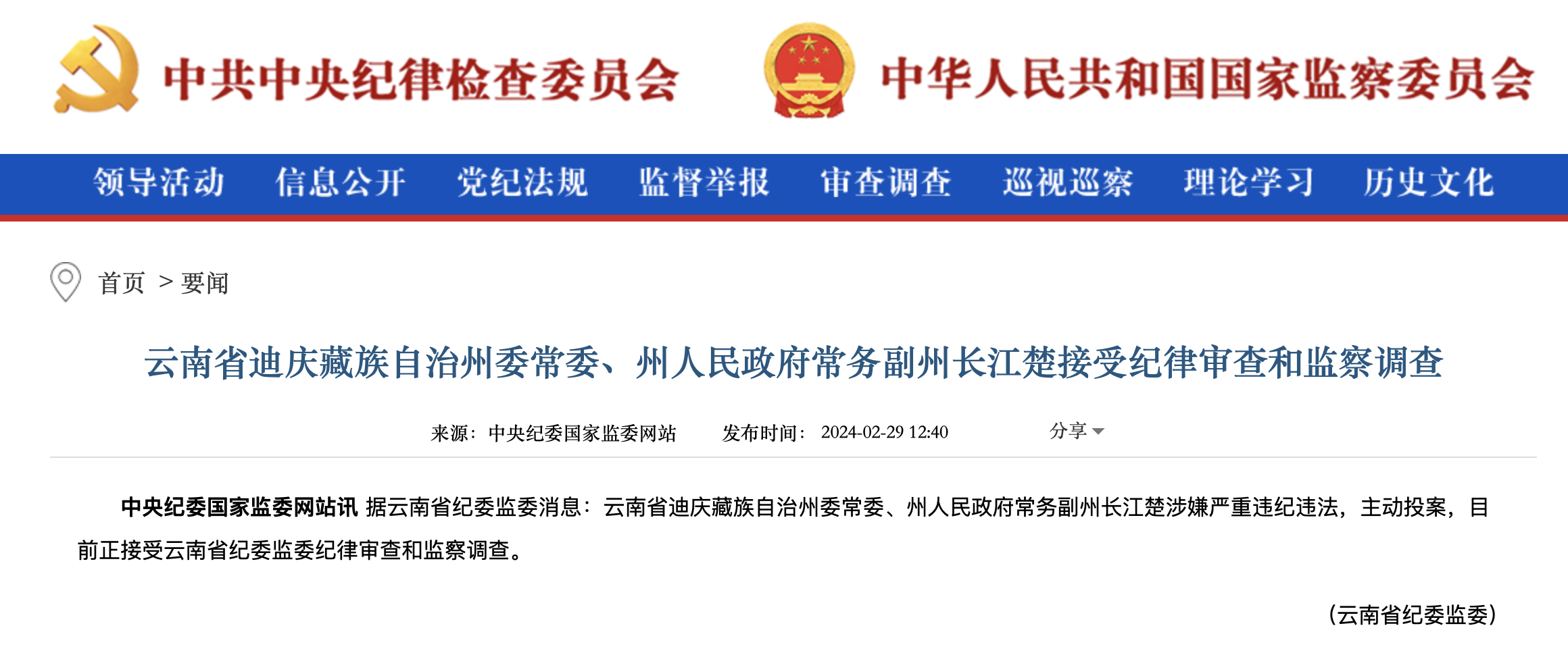 主动投案,云南省迪庆州常务副州长江楚接受审查调查