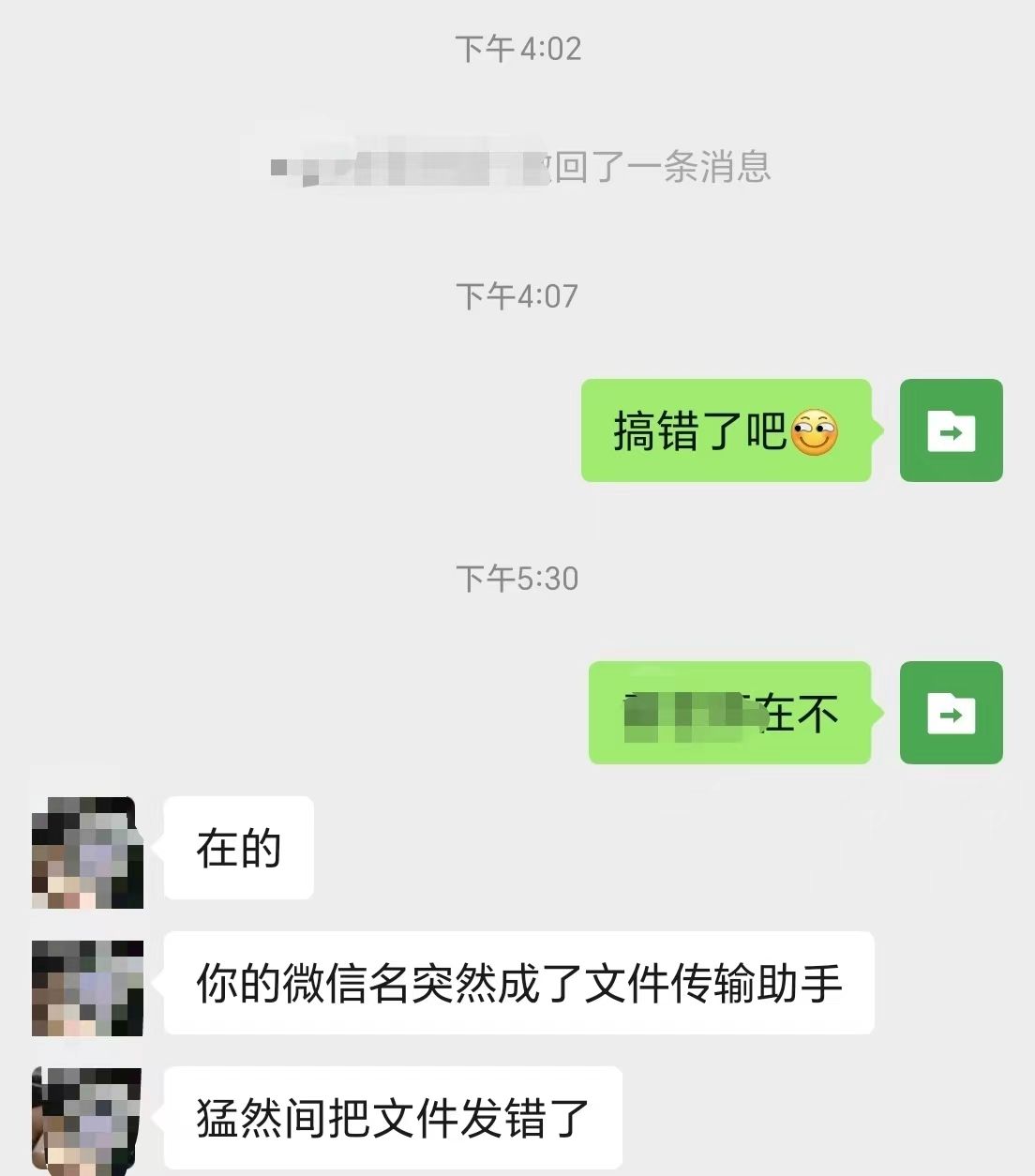 下午4点,记者又收到一位媒体同行发来的文件,但他发现发错后,撤回了。他解释,“你的微信名突然成了文件传输助手,猛然间把文件发错了。”他可能并未注意到,记者的微信名其实是一字之差的“文件传俞助手”。