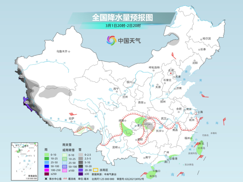 降雪最强时段为1日夜间至2日,阿里西部和南部、日喀则南部等地部分地区有大到暴雪,高海拔地区有大暴雪或特大暴雪(42毫米以上),新增积雪深度10~25厘米,高海拔地区45厘米以上。