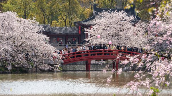 2023年3月26日,武汉东湖樱花进入盛花期,游客涌入东湖樱花园游玩,近距离感受武汉樱花美丽和樱花园的盛况