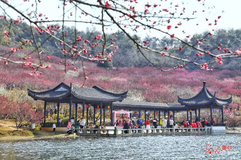 2024年3月3日,游客在安徽省巢湖市庙岗镇清水湾梅花园里赏花游玩。(马丰成摄/光明图片)