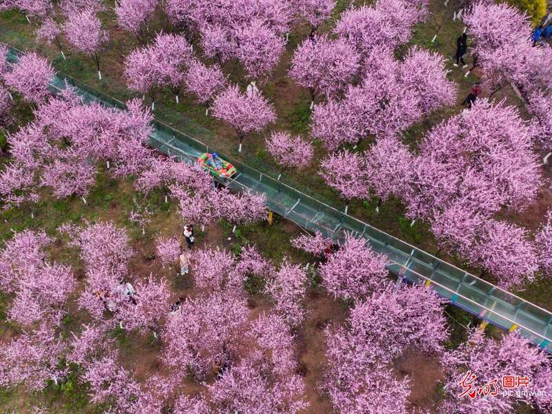 2024年3月3日,重庆市沙坪坝区的红岭溪谷景区,游客在体验玻璃高空漂流,他们乘坐的橡皮艇穿梭在花海间。(孙凯芳摄/光明图片)
