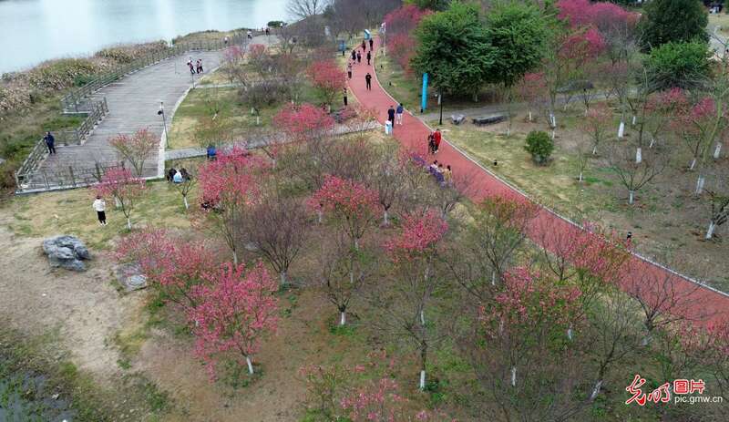 2024年3月2日,市民在广西贺州市爱莲湖公园观赏盛开的桃花。(廖祖平摄/光明图片)