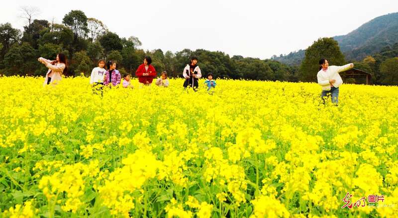 2024年3月3日,游人在江西省新余市渝水区南安乡百丈峰油菜花海观赏游玩。(廖海金摄/光明图片)