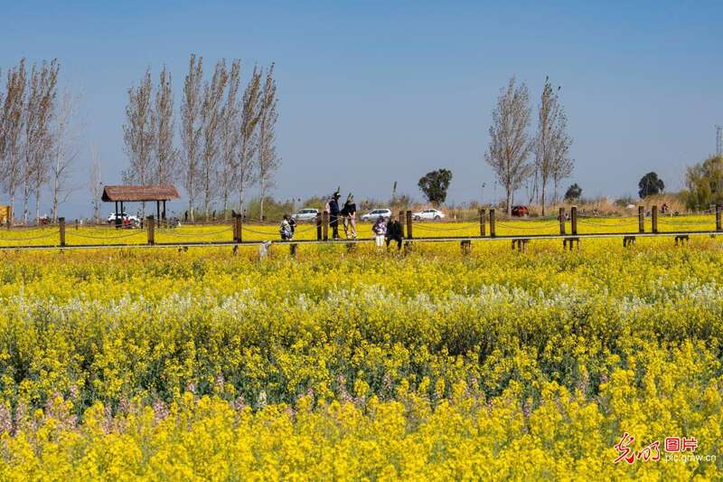 2024年3月3日,云南省昆明市晋宁区沙堤村油菜花盛开,美不胜收,吸引了不少市民游客前来观赏游玩。(郑益摄/光明图片)