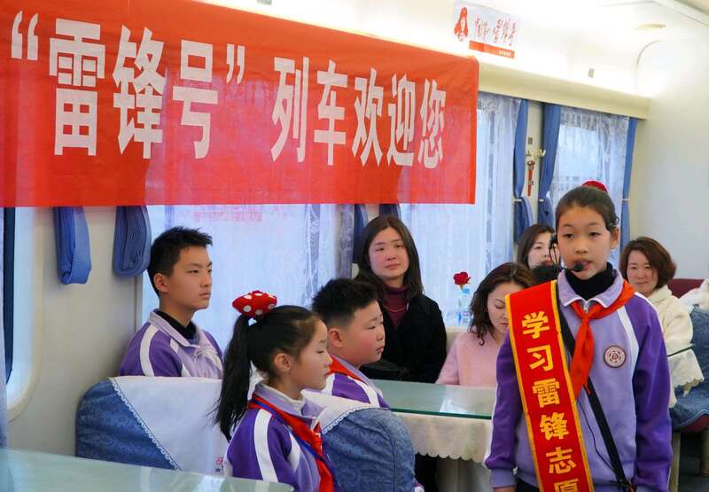 “雷锋号”列车区间牌上写着“中国第一雷锋号”字样,车厢板壁上挂着中国“第一雷锋号列车”的荣誉证书,乘务员们身上挂着“学习雷锋志愿者”,车厢悬挂着印有雷锋画像、学习雷锋的海报,列车广播上还不时传出“学习雷锋好榜样”的激扬旋律……
