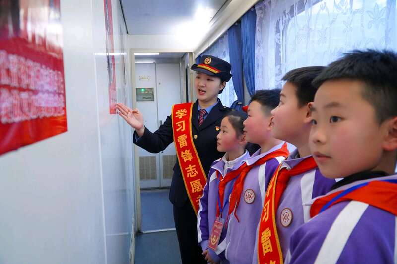 列车乘务员带领学生参观中国第一“雷锋号”列车车厢,学习雷锋故事。受访者供图