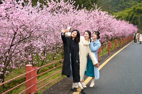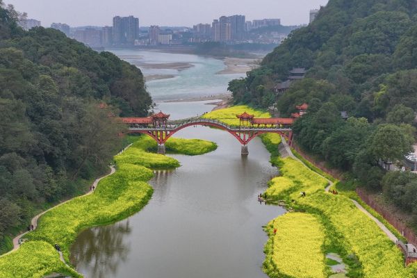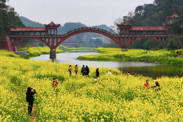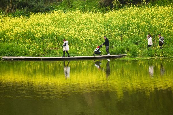 2024年3月5日,四川乐山市中区麻浩湿地公园沿河两岸油菜花吸引游客踏青赏花。 中新社记者 刘忠俊 摄