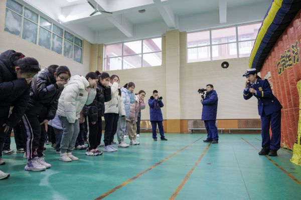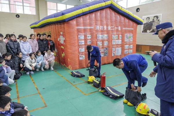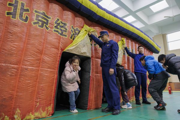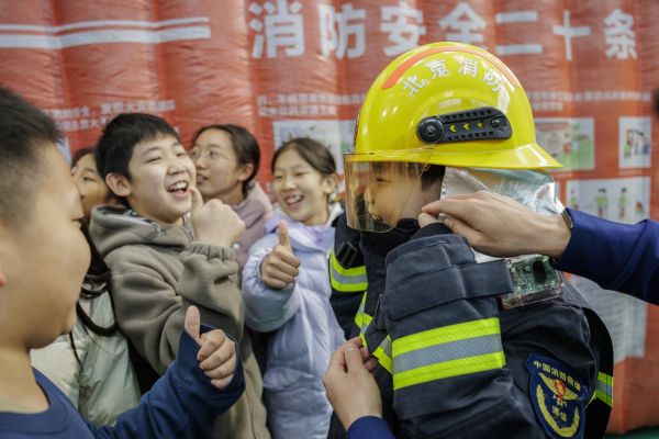 2024年3月5日,北京,经开区消防救援支队走进辖区亦庄第二中心小学,开展春季“消防安全开学第一课”活动,同学们现场体验消防装备。