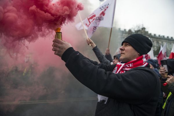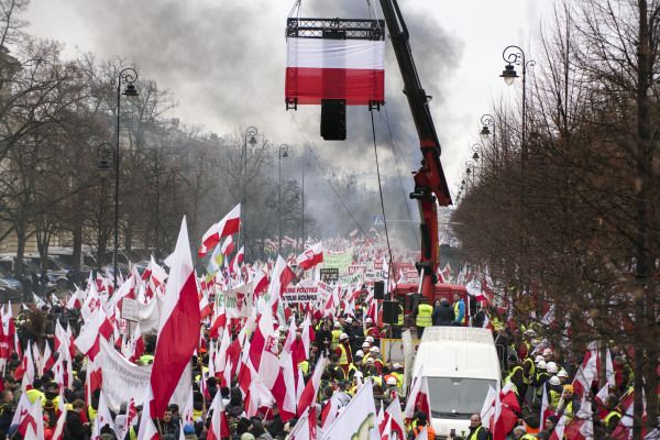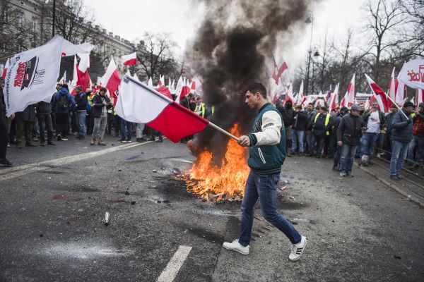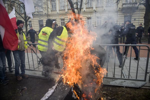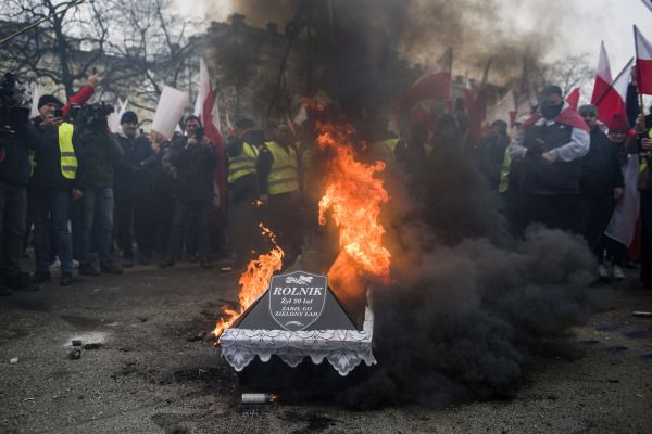 当地时间2024年3月6日,波兰华沙,农民们在总理办公室前举着标语牌。数千名波兰农民聚集在总理办公室外,抗议欧盟的农业政策。波兰农民反对欧盟委员会最近决定将与乌克兰的免税贸易延长到2025年,他们也不希望实施欧盟的绿色协议,从乌克兰进口廉价农产品,并要求支持动物养殖。农民们在华沙街头点燃照明弹,点燃篝火,并与警察发生冲突。