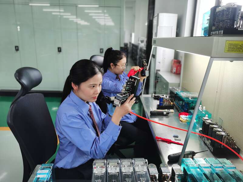 女职工谢圆圆、蒋慧正在对验收完的继电器进行封罩。李静/摄