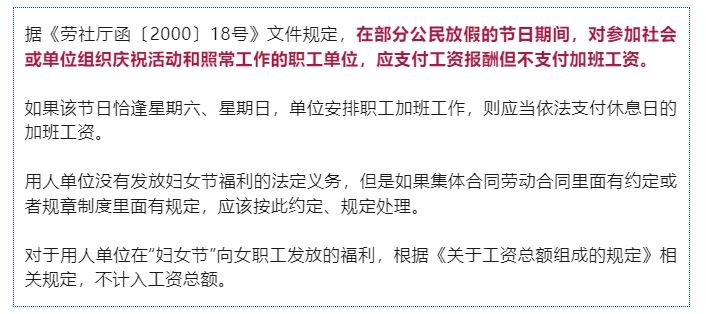 据《劳社厅函〔2000〕18号》文件规定,在部分公民放假的节日期间,对参加社会或单位组织庆祝活动和照常工作的职工单位,应支付工资报酬但不支付加班工资。