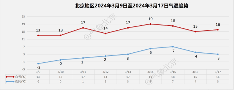 北京市气象台9日9时发布:今天白天晴,北转南风二三级,最高气温13℃;夜间晴转多云,南转北风一二级,最低气温零下1℃。