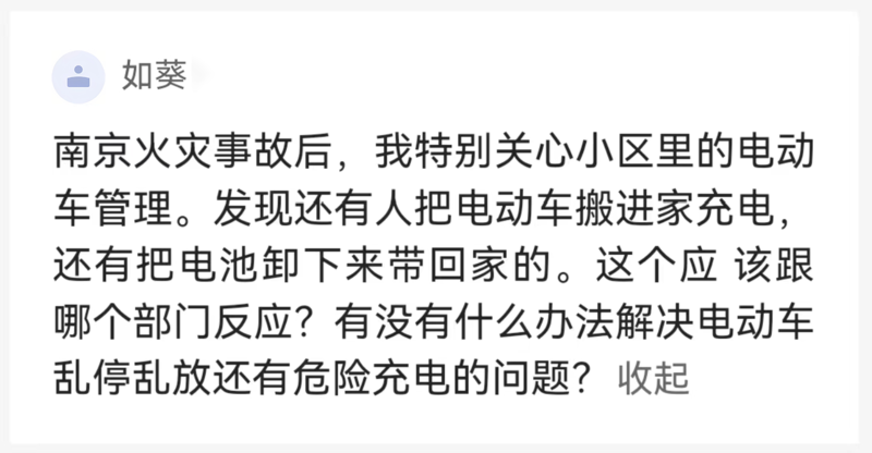 如何解决电动车的停放和充电问题?李连祥建议,首先当地政府要出台相关的政策,设置电动车停放区域和电池充电设备。第二,物业要对小区进行整体规划,合理规划出电动车停放区域和充电桩设置区域。