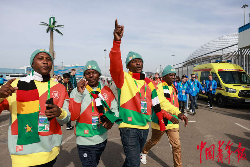 3月2日,俄罗斯索契,参加世界青年联欢节的津巴布韦青年在路上唱起民族歌曲。中青报·中青网记者 曲俊燕/摄