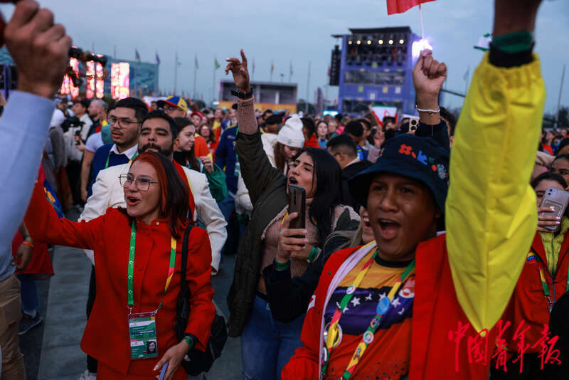 3月4日,俄罗斯索契,参加世界青年联欢节的各国青年伴随舞台上的音乐热情起舞。中青报·中青网记者 曲俊燕/摄