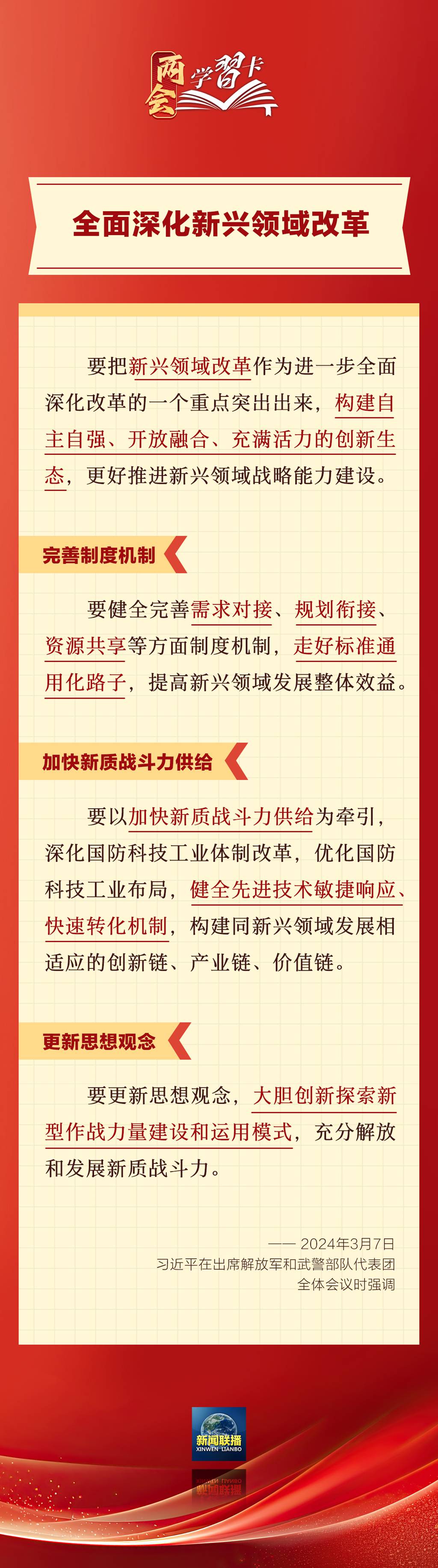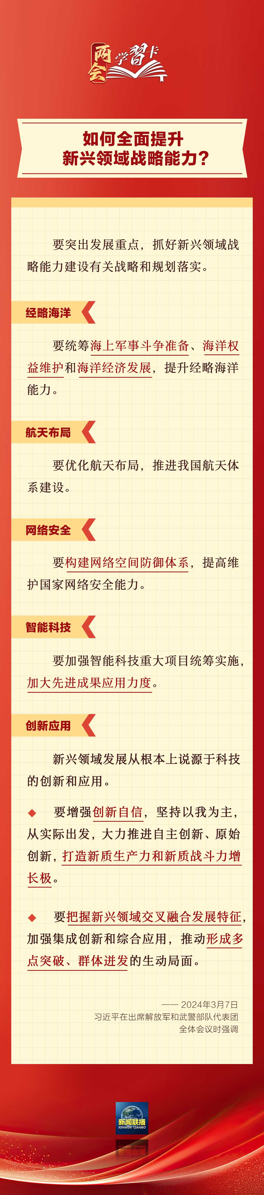 3月7日,习近平在出席解放军和武警部队代表团全体会议时强调,强化使命担当,深化改革创新,全面提升新兴领域战略能力。如何提升新兴领域战略能力?一起学习↓↓↓