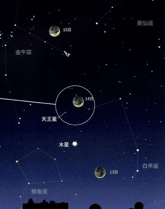 观星指南:西方低空一弯残月将在这三天依次经过木星、天王星和昴星团附近,其中,14日傍晚,天王星距离月亮的角距离大约为3度。