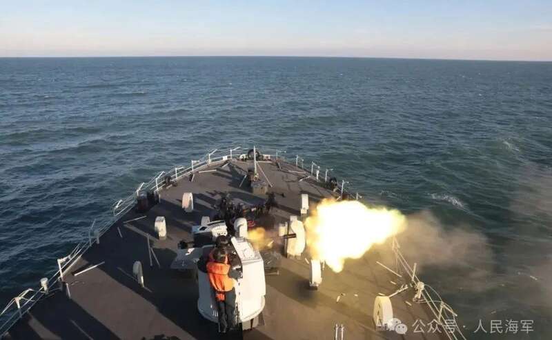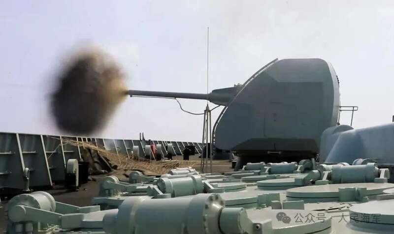 ▲海口舰主炮对海射击。温彬 摄