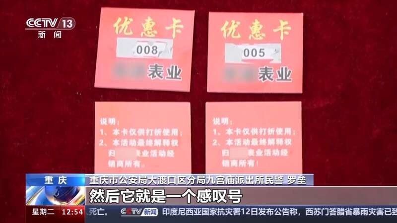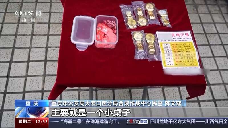 重庆市公安局大渡口区分局合成作战中心民警 陈文建:他们作案工具,主要就是一个折叠桌,然后随身携带抽奖的卡片,还有金黄色的手表这些道具。