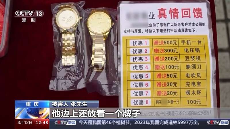 张先生:当时我买菜过来到天桥上以后,那里摆了一个摊,旁边站了几个男人,摆摊那个人说免费送手表,是厂家搞宣传,后来就给我们边上几个人,每人给了一块金黄的手表。