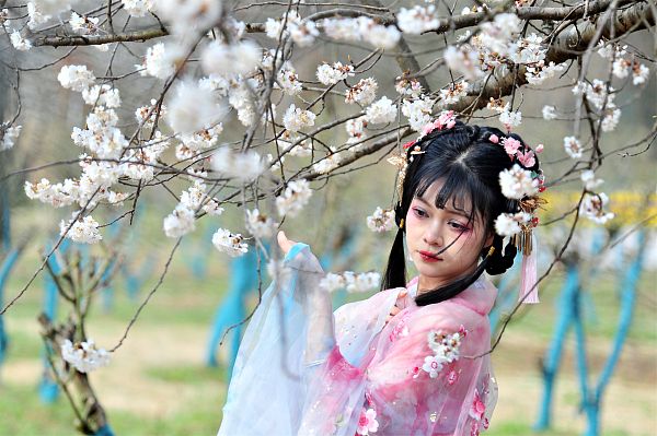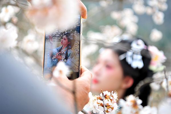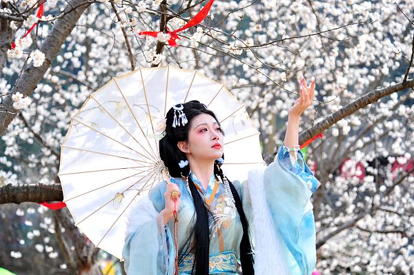 2024年3月12日,湖北宜昌,游客身着汉服在夷陵区黄花镇上洋村三峡奇潭景区的樱花长廊里观光游览。