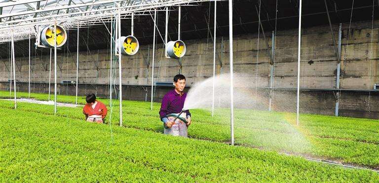 3月3日,安徽阜阳市颍东区插花镇瓦大公司育苗基地,农民在温室大棚给番茄秧苗浇水。 宿 飞摄 (中经视觉)