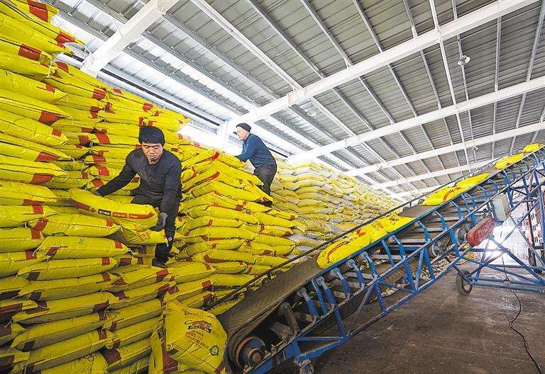 3月6日,新疆昌吉昌农农业生产资料有限公司农资配送中心,工人在装运化肥,保障农资供应。 何 龙摄 (中经视觉)