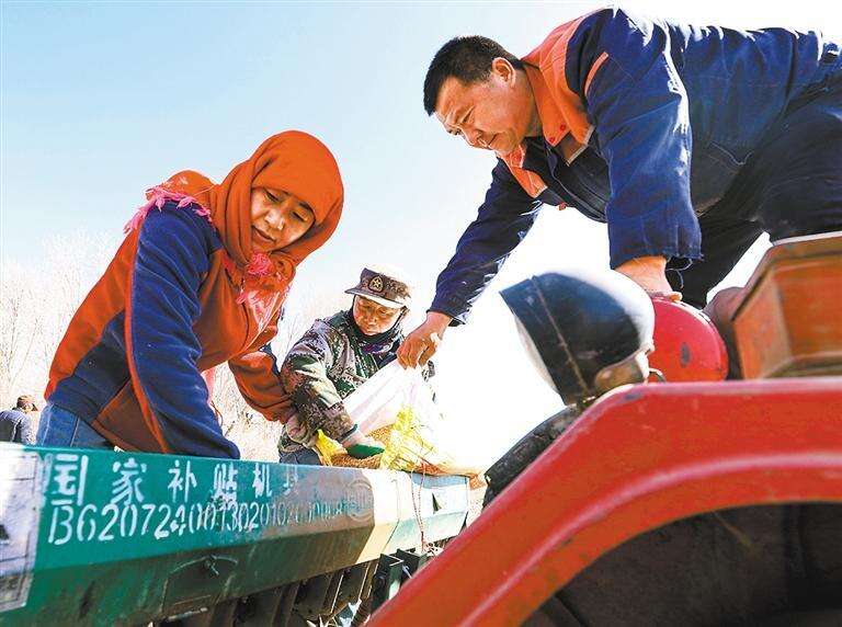 3月7日,甘肃高台县罗城镇侯家庄村,农户正在往播种机里放入小麦种子。王 将摄 (中经视觉)