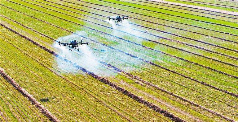 3月7日,山西襄汾县西贾乡西李村,植保无人机对麦田开展春季飞防作业。李现俊摄(中经视觉)