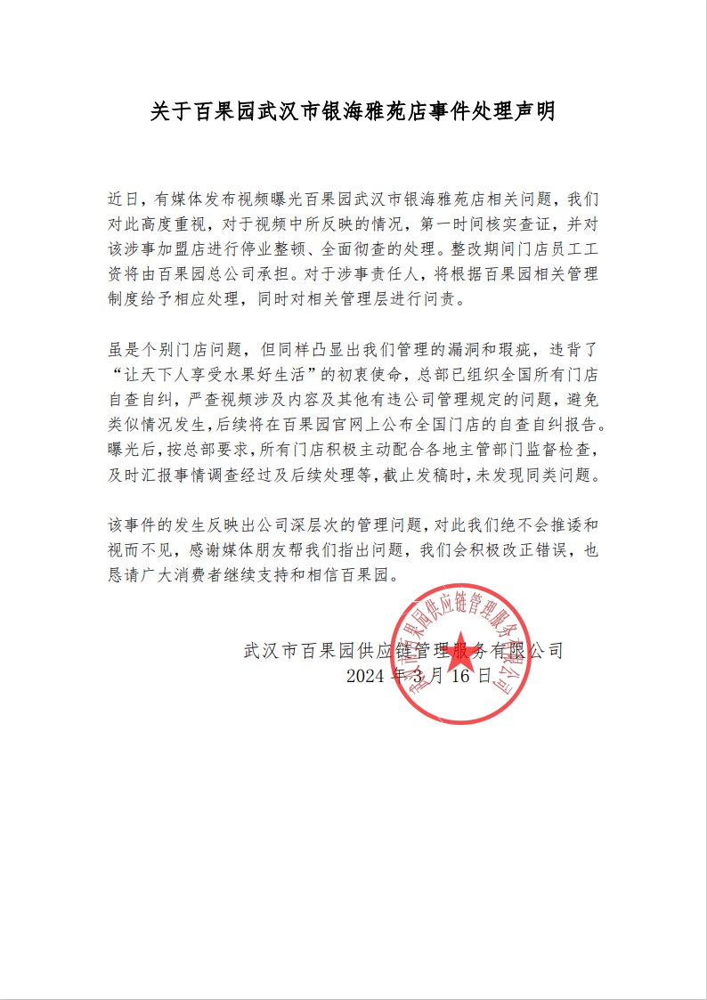 百果园回应将烂果做高端果切售卖等问题:涉事加盟店停业整顿