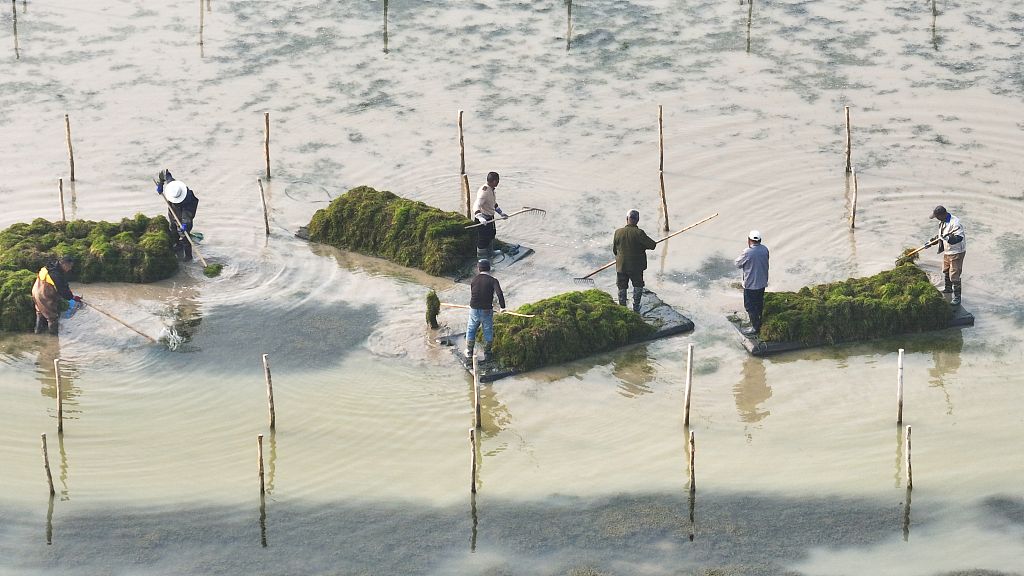 2024年3月16日,江苏宿迁,泗洪县临淮镇溧河村的蟹农在蟹塘里栽种水草。