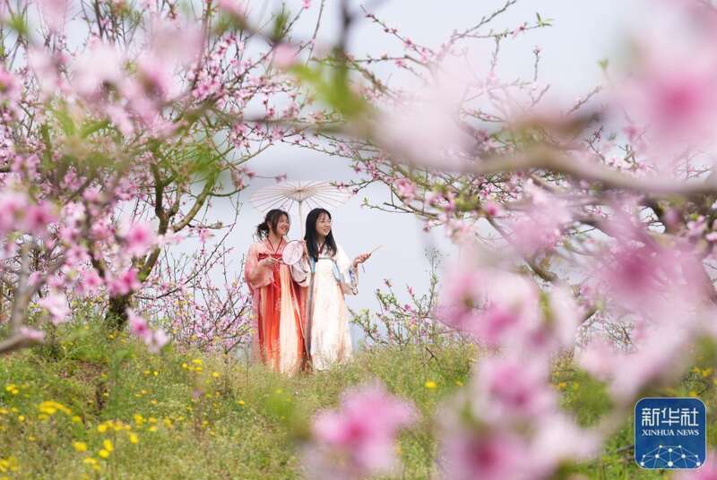 3月17日,游客在重庆市北碚区澄江镇民权村天歌园水蜜桃采摘基地游玩。新华社发(秦廷富摄)