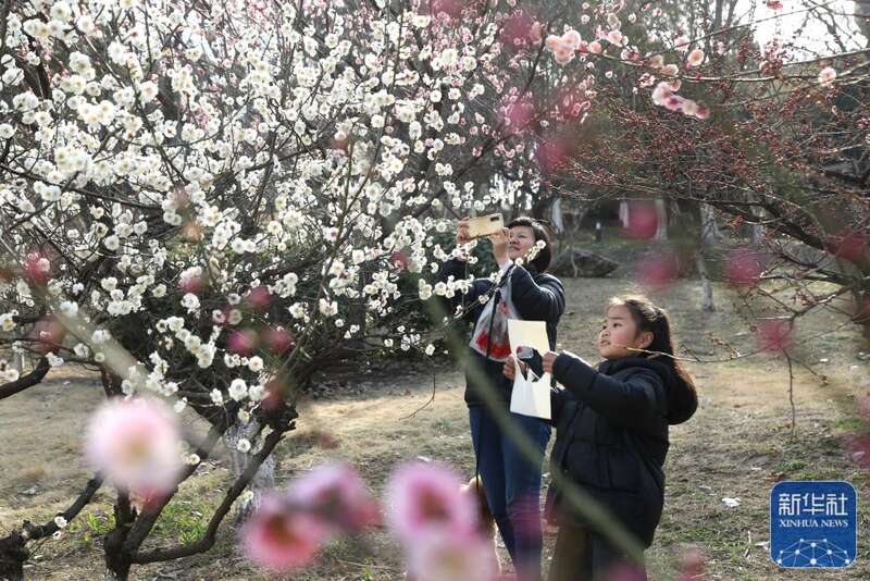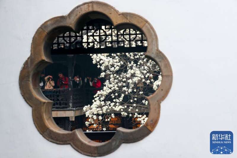 3月17日,游客在江苏扬州何园景区赏花拍照。