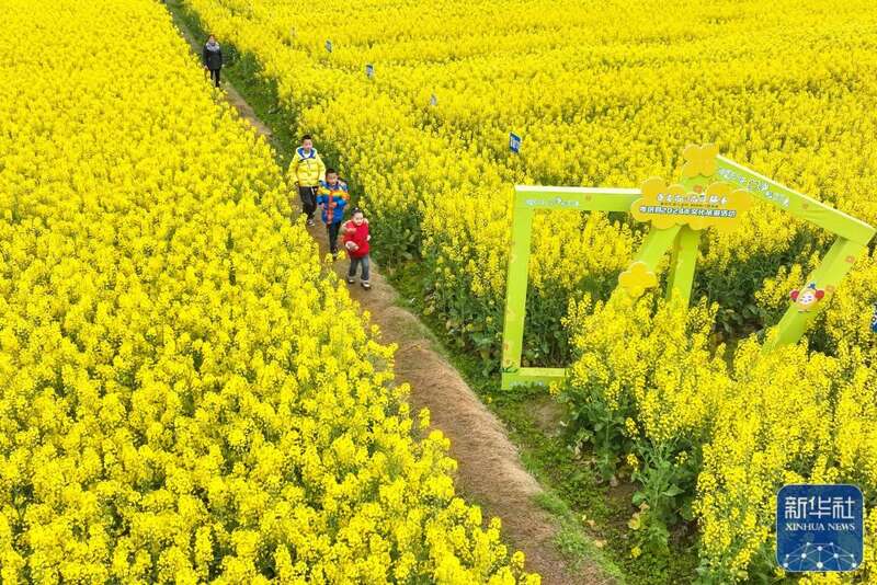 3月17日,人们在湖南省永州市双牌县泷泊镇枫木山村油菜花田赏花游玩。新华社发(蒋克青摄)