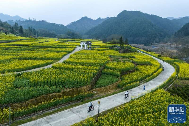 3月17日,在安徽省黄山市歙县昌溪村,自行车爱好者在油菜花海中骑行。新华社发(樊成柱摄)