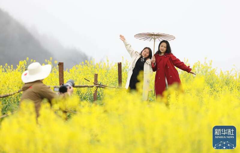 3月17日,游客在贵州省铜仁市玉屏侗族自治县朱家场镇混寨村油菜花田拍照。新华社发(胡攀学摄)