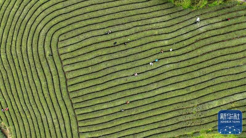 3月16日,人们在贵州省遵义市凤冈县的生态茶园里采摘春茶(无人机照片)。新华社发(罗星汉摄)