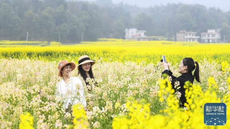 3月17日,游客在湖南省衡阳市衡阳县库宗桥镇华山村油菜花田赏花拍照。新华社发(周秀鱼春摄)