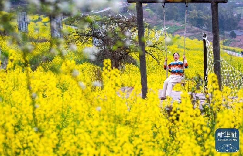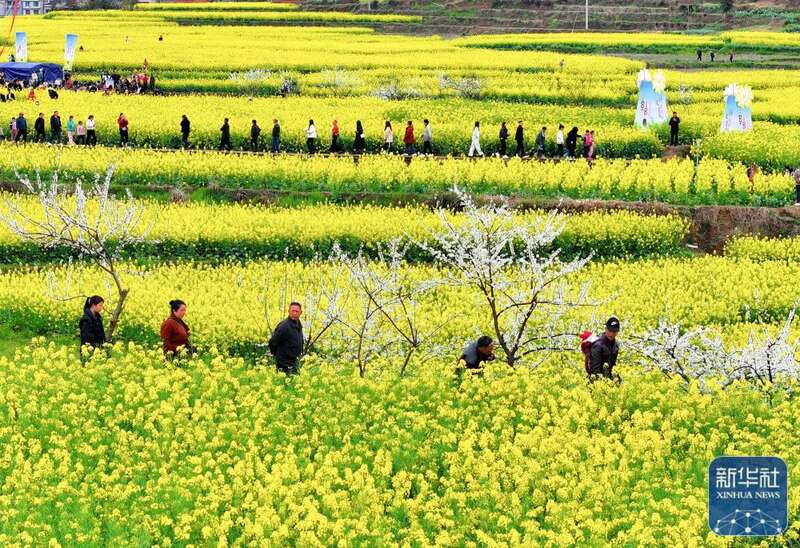 3月17日,游客在重庆市南川区峰岩乡千秋村油菜花田里踏青游玩。新华社发(瞿明斌摄)