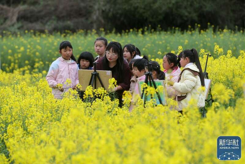 3月17日,人们在贵州省开阳县米坪乡油菜花田里写生。
