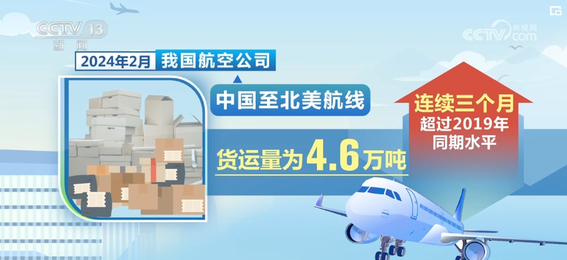 受跨境电商等多因素带动,2024年以来,我国至海外主要货运市场均表现良好。2月,我国航空公司在中国至欧洲航线完成货运规模最大,达9.2万吨,占比达42.3%;至北美航线货运量为4.6万吨,连续3个月超过2019年同期水平;与共建“一带一路”国家之间完成货邮运输量6.6万吨,占比超过三成,较2019年同期增长143.8%。